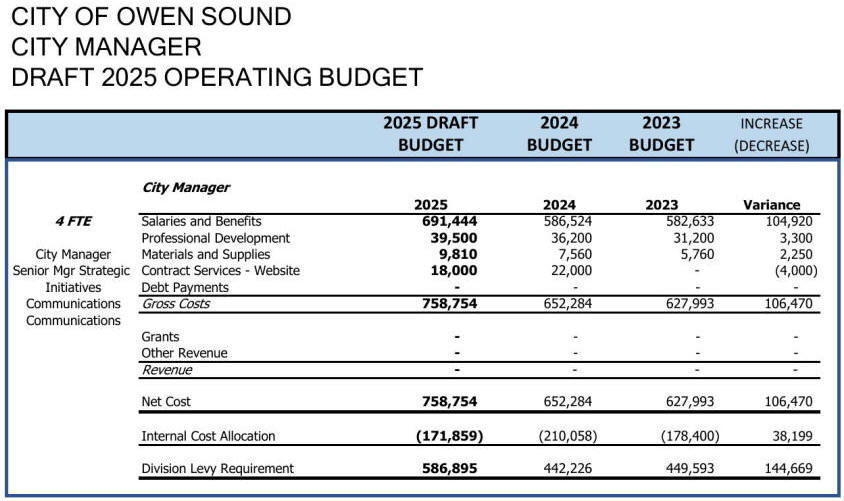 | City Manager Salaries & Benefits Expense 2025 Increase Source: Owen Sound 2025 Budget |