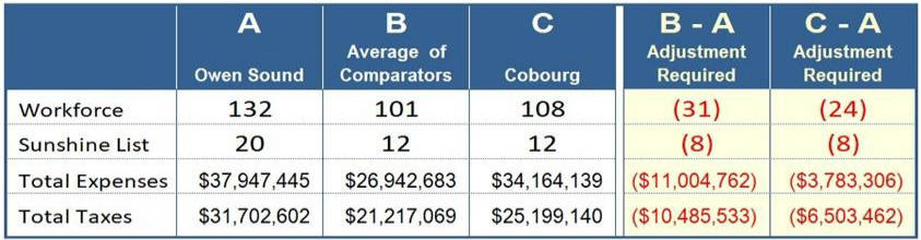 If Owen Sound were to match the average of the three primary comparators we would need to reduce the workforce by 31 employees which would result in a reduction of $3.9 million in Salaries & Benefits expense. If we were to just match Cobourg 's workforce we would have to reduce Owen Sound 's workforce by 24 employees; which would result in a reduction in Salaries & Benefits expense of $1.5 million. This translates into a reduction in taxes of approximately 4.7%.
