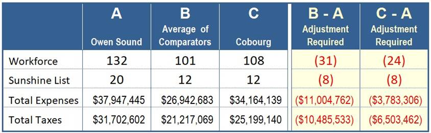 If Owen Sound were to match the average of the three primary comparators we would need to reduce the workforce by 31 employees which would result in a reduction of $3.9 million in Salaries & Benefits expense. If we were to just match Cobourg 's workforce we would have to reduce Owen Sound 's workforce by 24 employees; which would result in a reduction in Salaries & Benefits expense of $1.5 million. This translates into a reduction in taxes of approximately 4.7%.